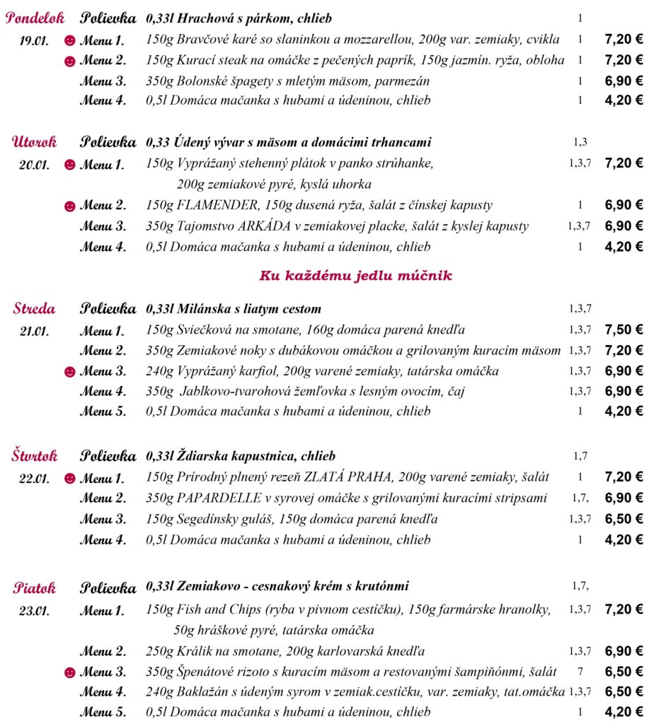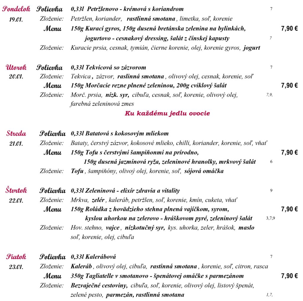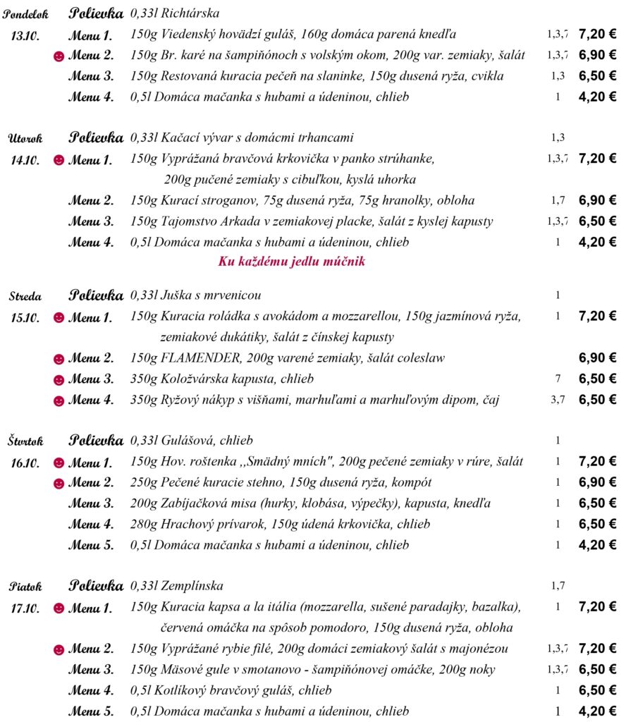 1-Obilniny obsahujúce lepok, 2- Kôrovce, 3- Vajcia, 4-Ryby, 5-Arašidy, 6-Sójové bôby, 7-Mlieko, 8-Orechy 9-Zeler, 10-Horčica, 11-Sezamové semena, 12-Kysličník siričitý a riričitany, 13-Vlčí bôb, 14-Mäkkýše
