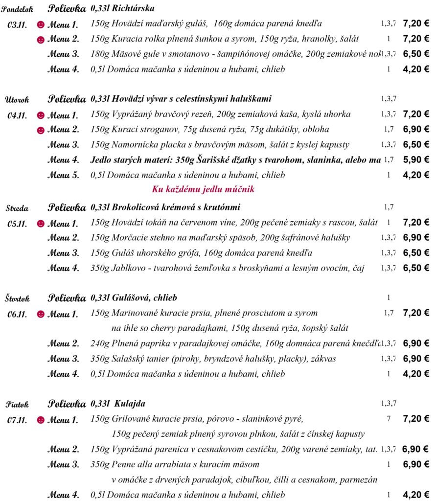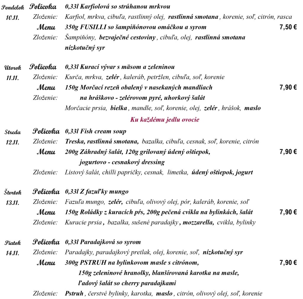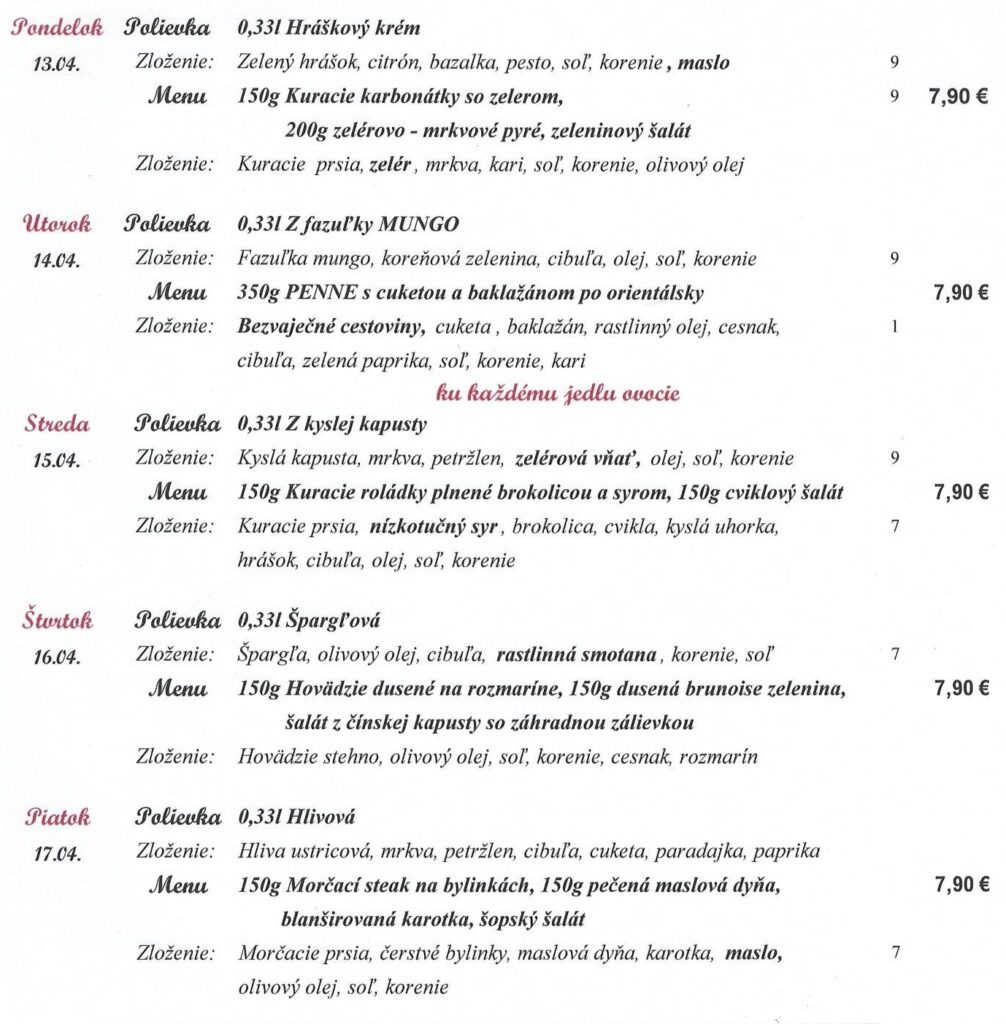 1-Obilniny obsahujúce lepok, 2- Kôrovce, 3- Vajcia, 4-Ryby, 5-Arašidy, 6-Sójové bôby, 7-Mlieko, 8-Orechy 9-Zeler, 10-Horčica, 11-Sezamové semena, 12-Kysličník siričitý a riričitany, 13-Vlčí bôb, 14-Mäkkýše