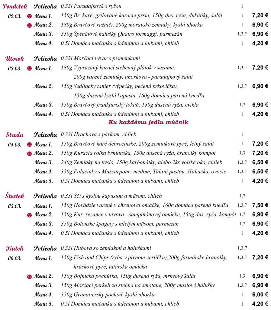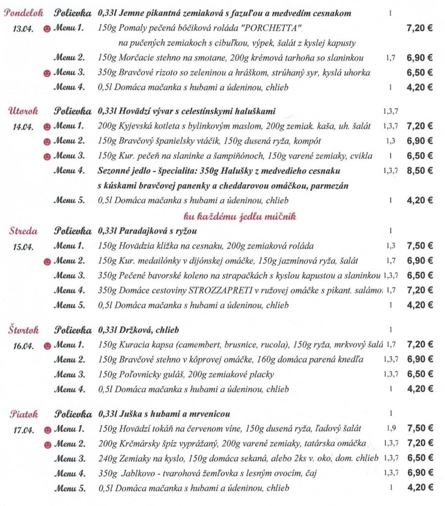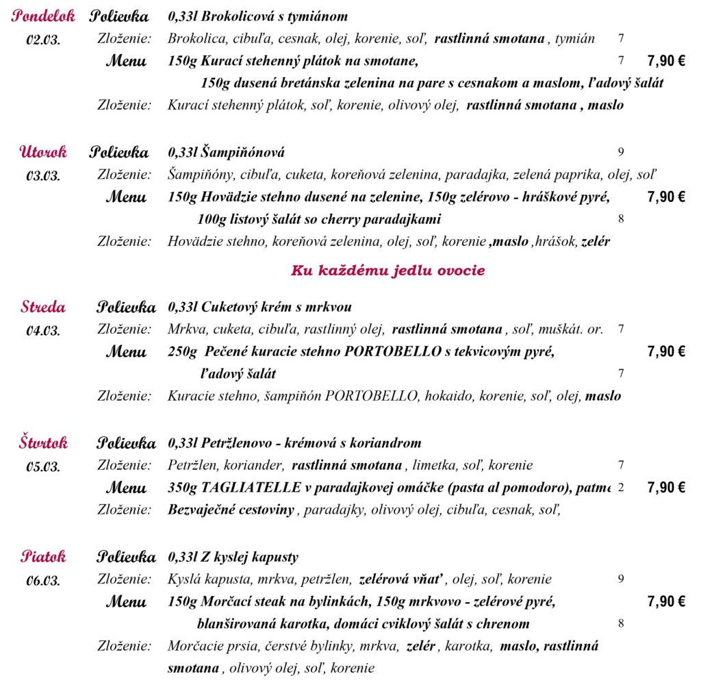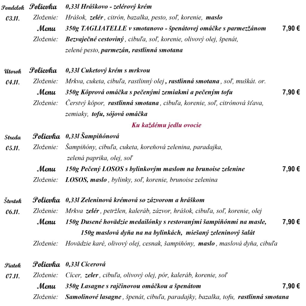 1-Obilniny obsahujúce lepok, 2- Kôrovce, 3- Vajcia, 4-Ryby, 5-Arašidy, 6-Sójové bôby, 7-Mlieko, 8-Orechy 9-Zeler, 10-Horčica, 11-Sezamové semena, 12-Kysličník siričitý a riričitany, 13-Vlčí bôb, 14-Mäkkýše